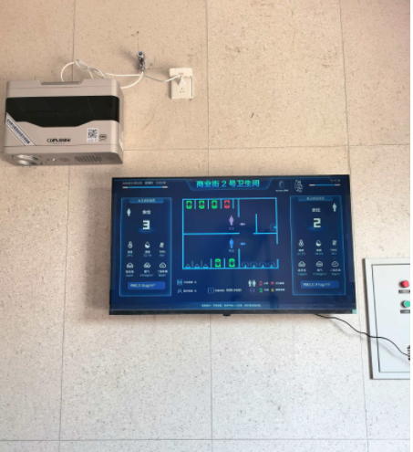 1、進(jìn)入公廁我們就可以看到引導(dǎo)大屏,大屏上面顯示每個廁所的環(huán)境指數(shù),坑位占用情況,紅綠表示占用,綠色表示空閑,信息一目了然。